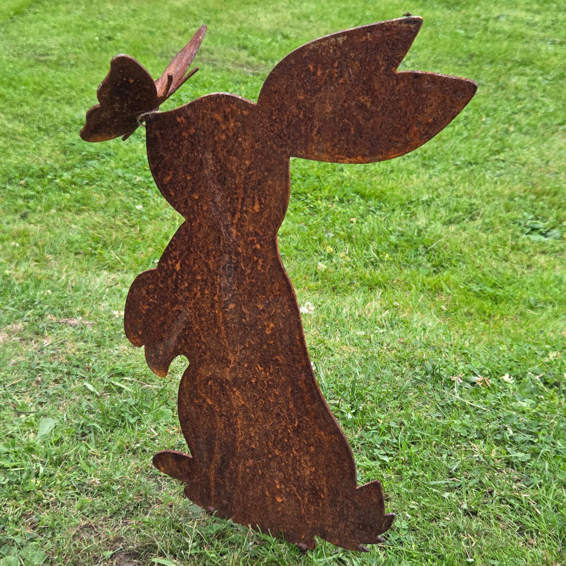 Dieser dekorative Hase aus Metall im Edelrost-Look bringt eine verspielte und zugleich rustikale Note in jeden Garten. Der kleine Schmetterling auf der Nase macht das Motiv zu einem besonderen Hingucker und sorgt für einen charmanten, frühlingshaften Akzent – ideal für Beet, Rasen, Pflanzkübel oder Eingangsbereich.