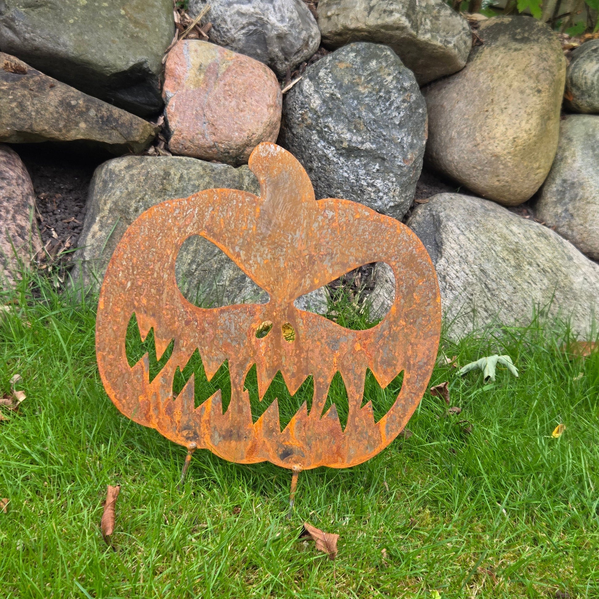 Kürbis mit Zähnen – Edelrost Deko für den Garten
